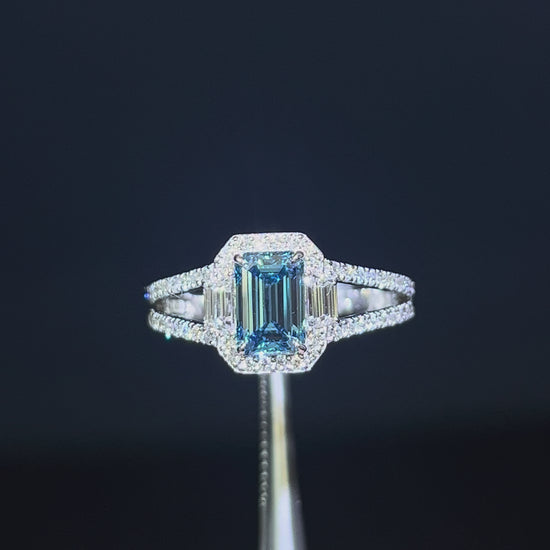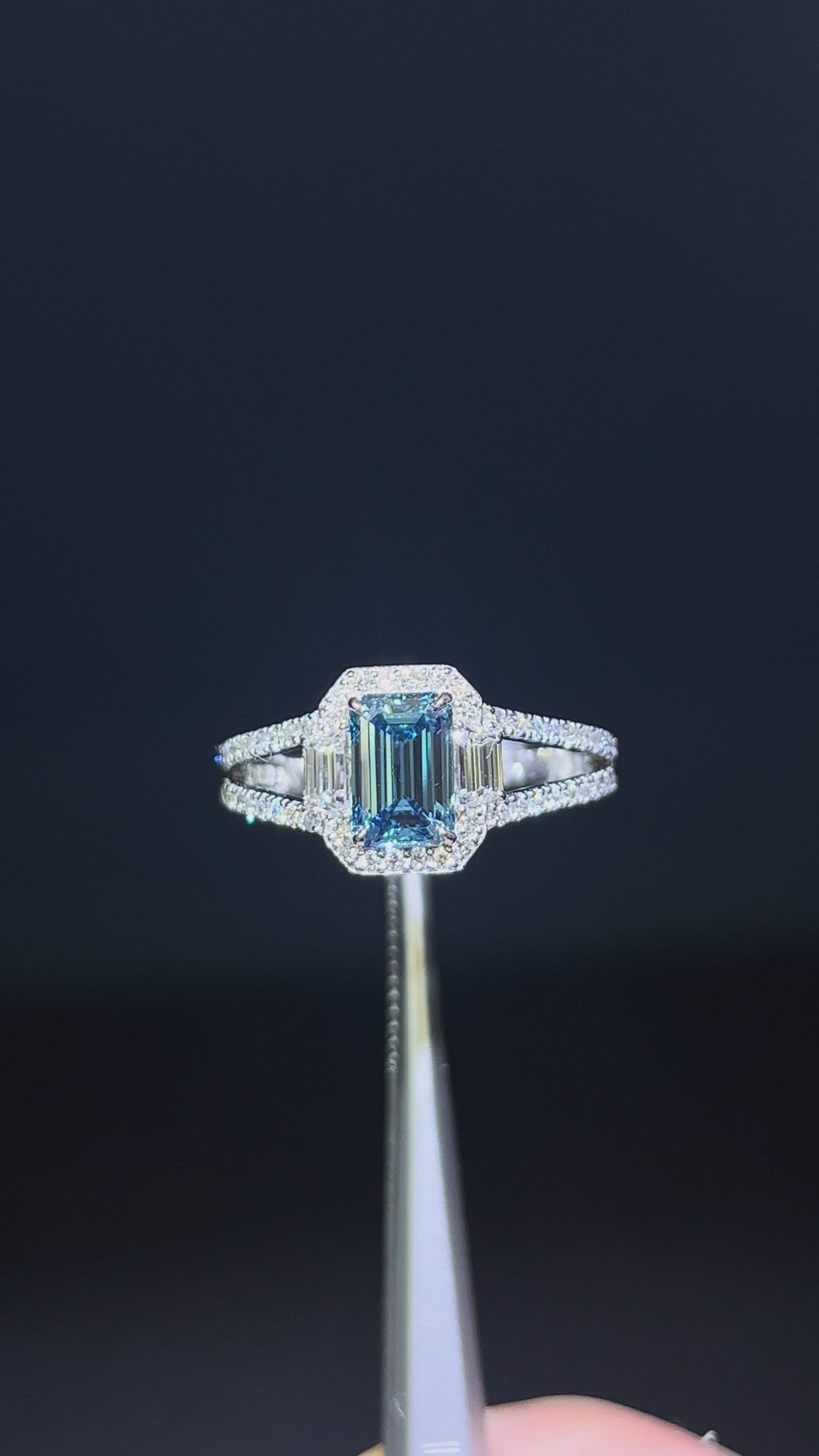 1.00CT VIVID BLUE DIAMOND EMERALD CUT 3 STONE RING