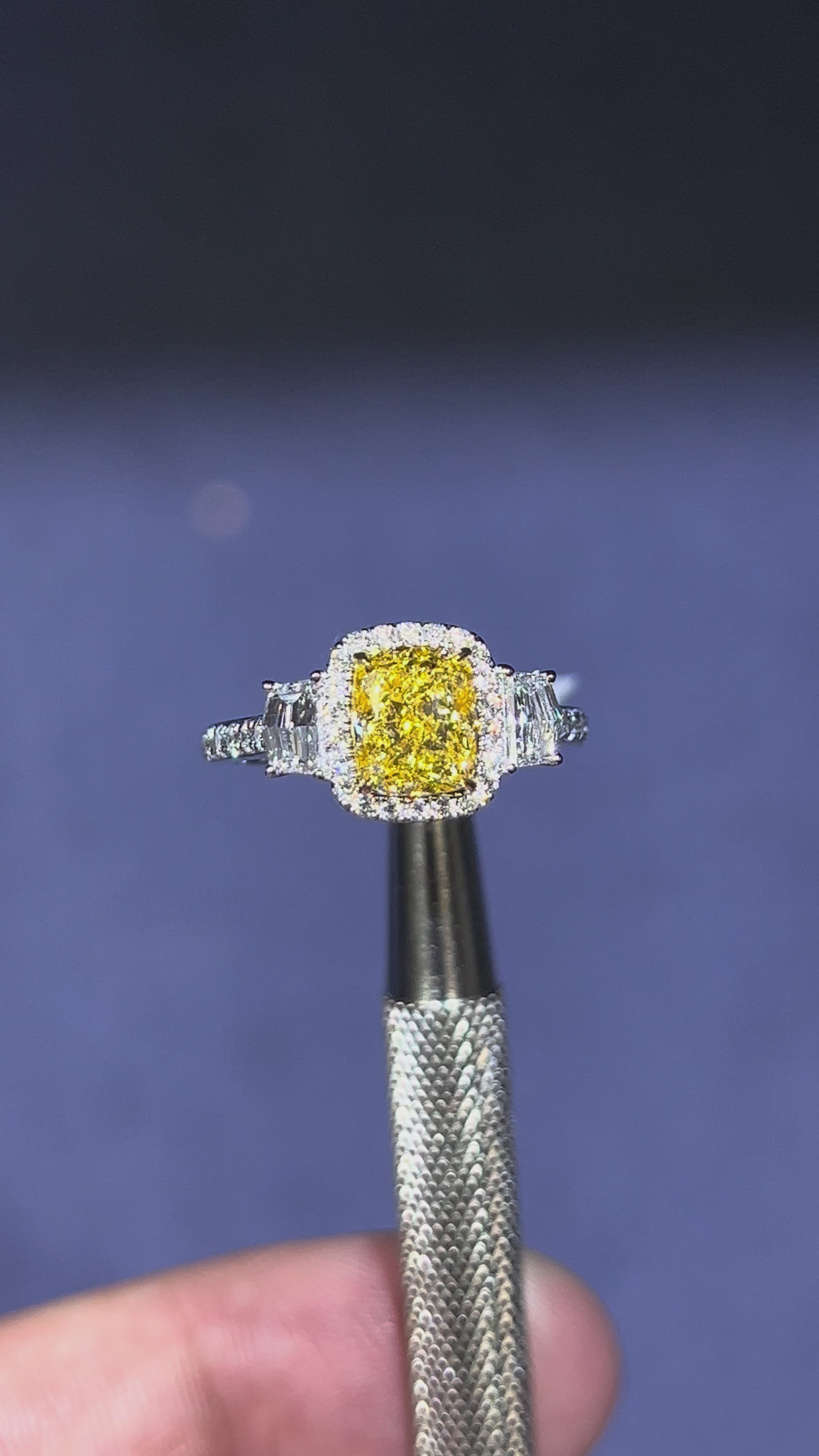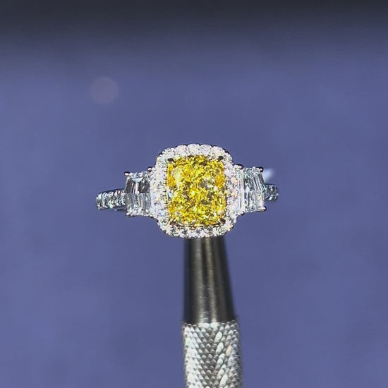 1.50CT VIVID YELLOW CUSHION CUT DIAMOND 3 STONE RING