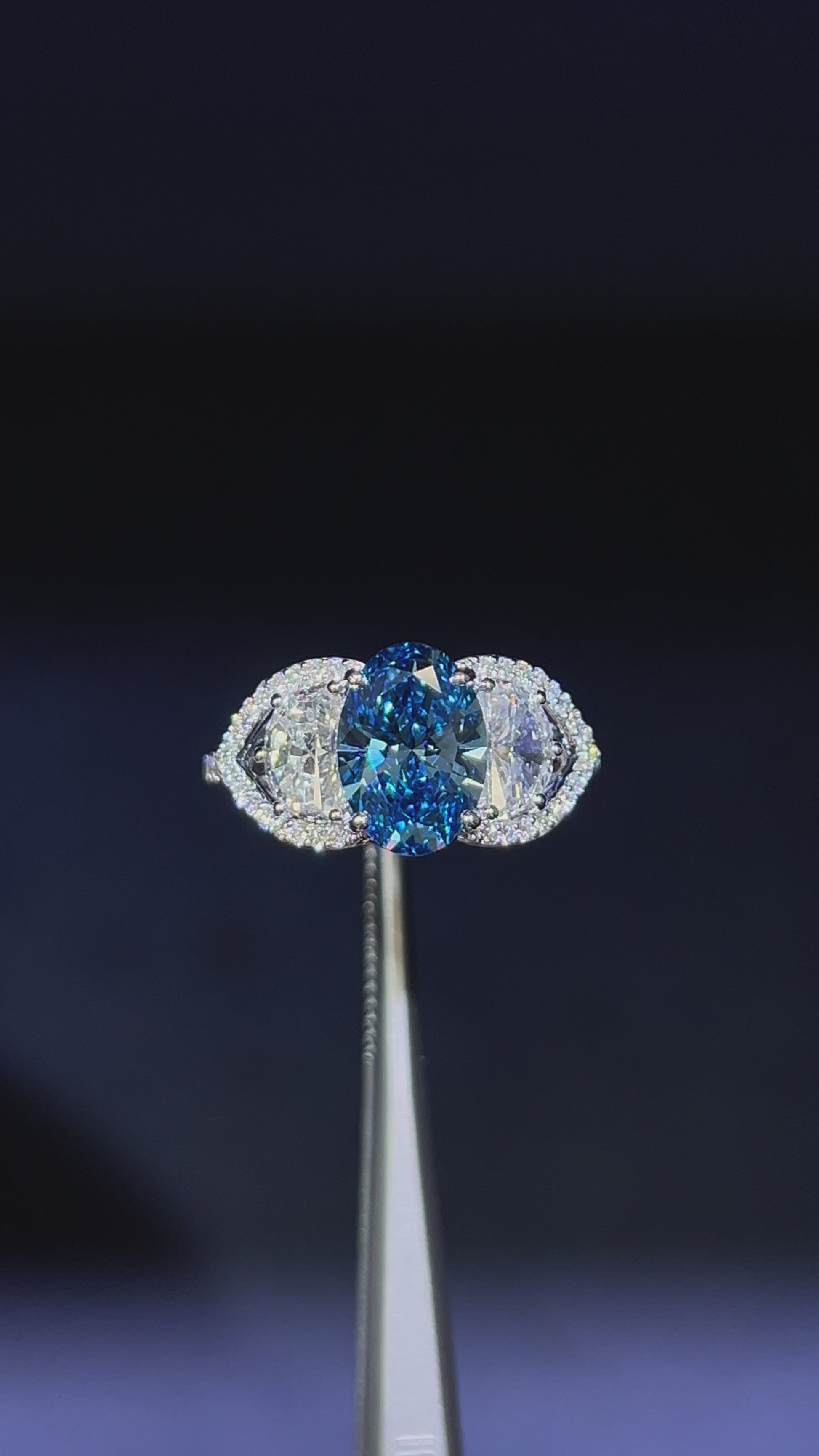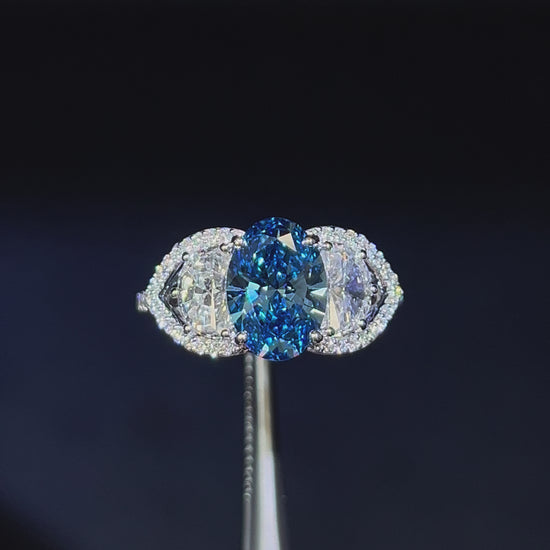 2.00CT VIVID BLUE DIAMOND OVAL CUT 3 STONE RING