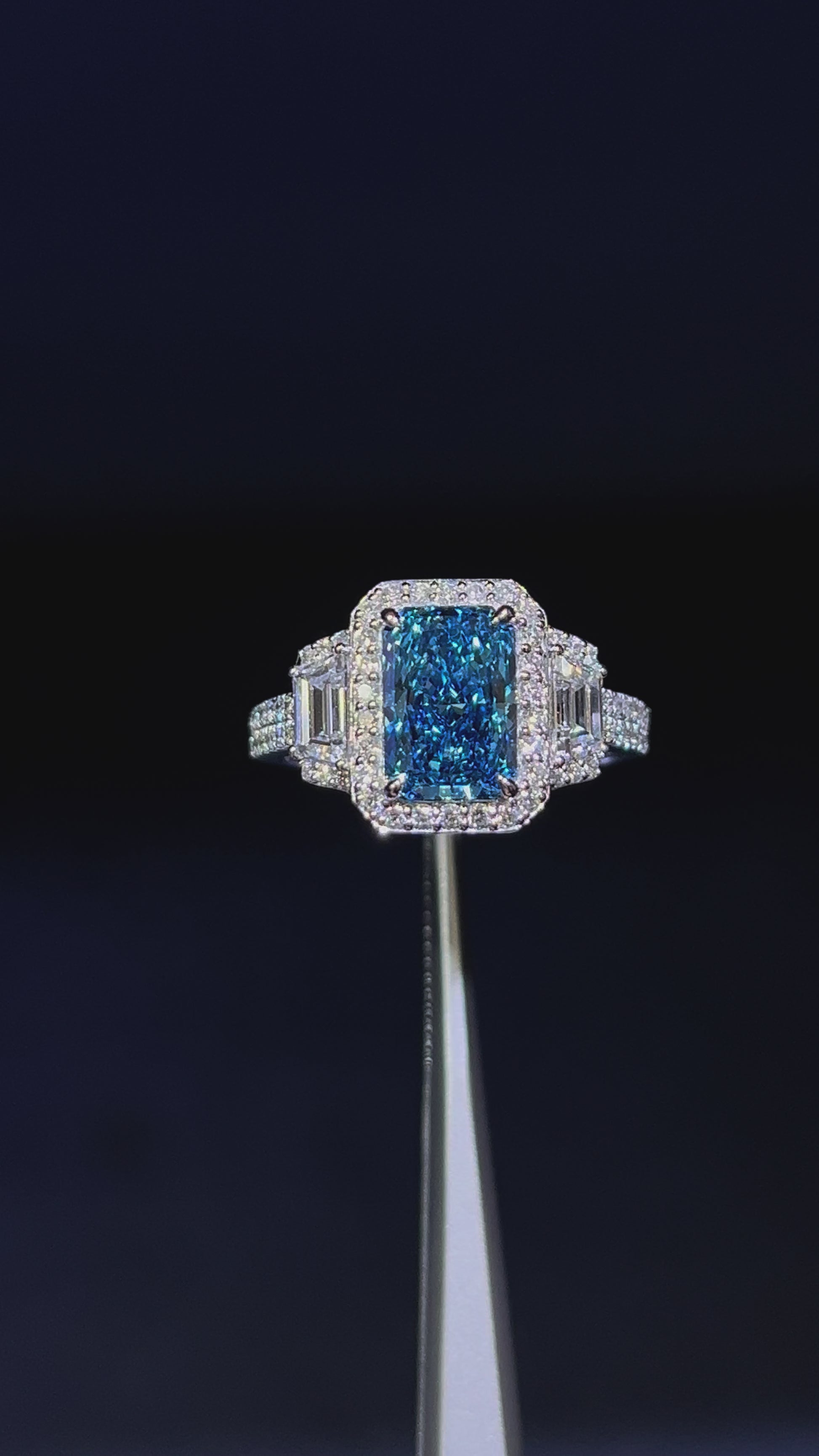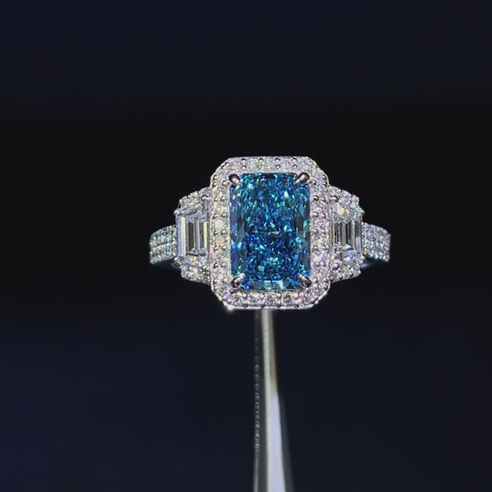 2.00CT VIVID BLUE RADIANT CUT DIAMOND 3 STONE RING