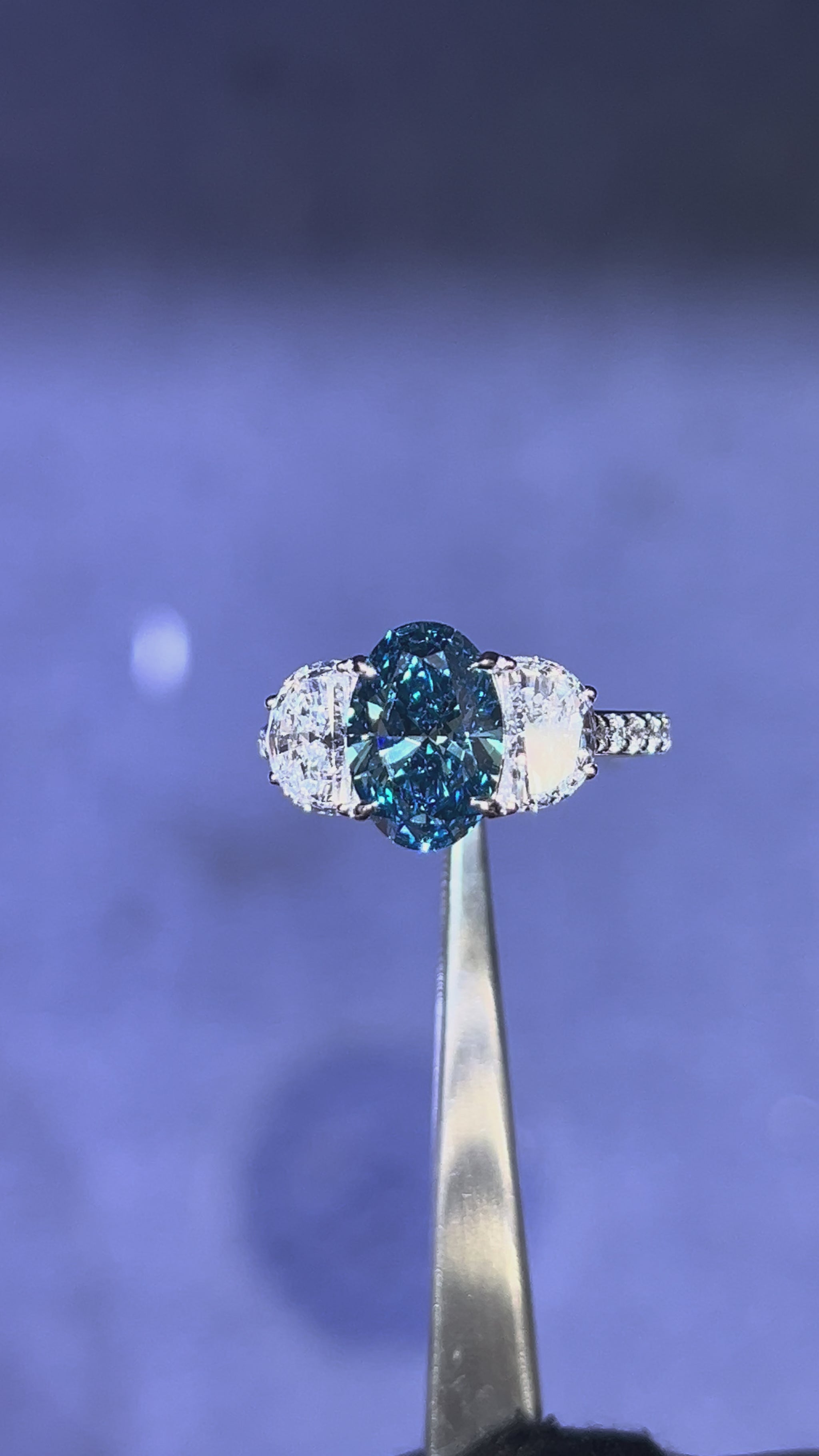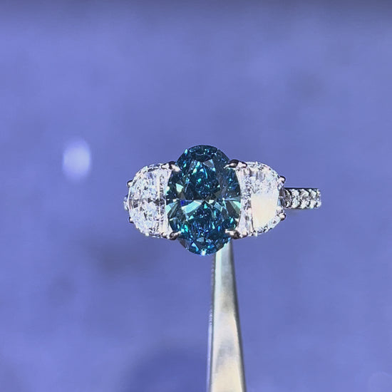 2.50CT VIVID BLUE OVAL CUT DIAMOND 3 STONE RING