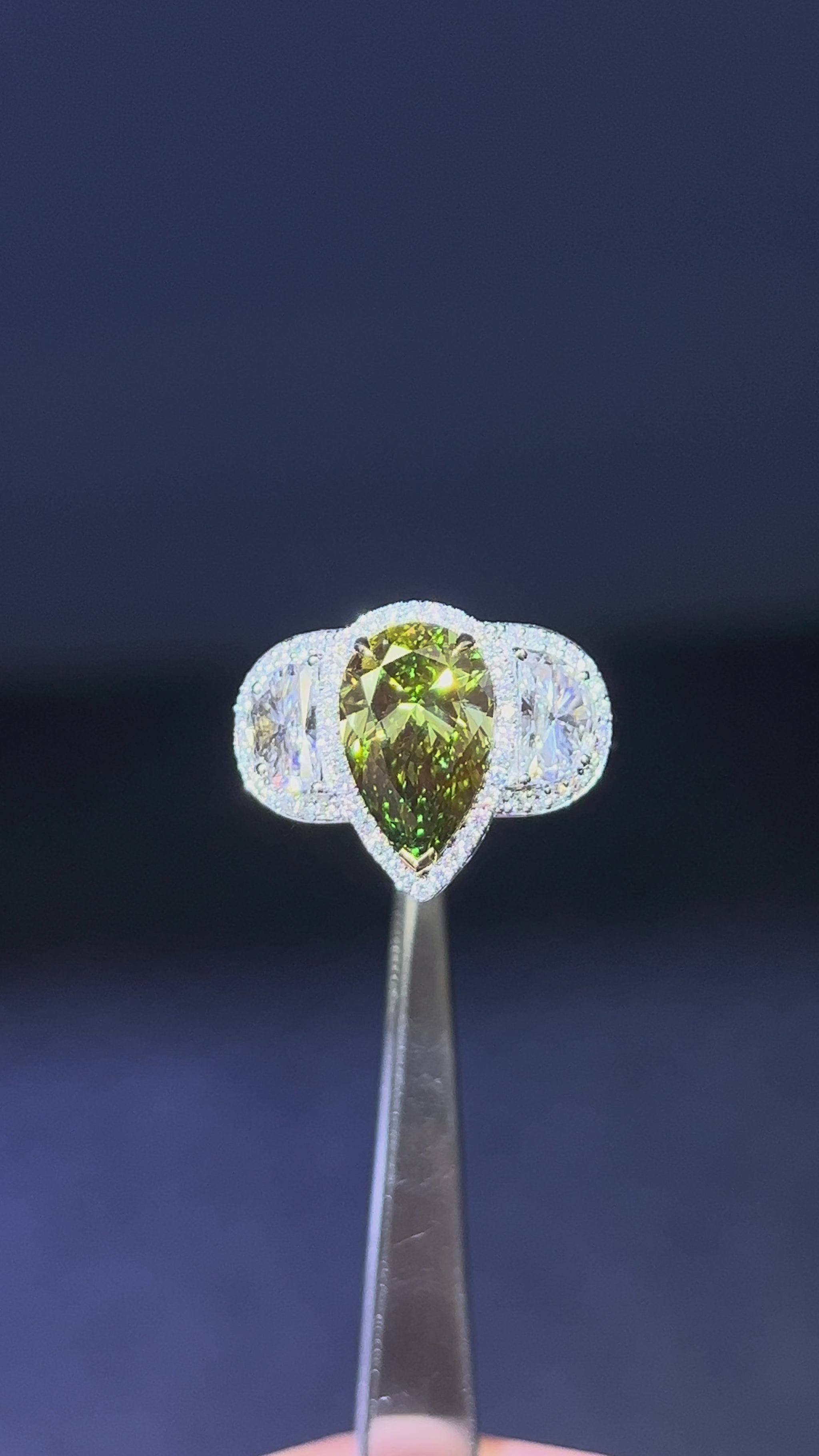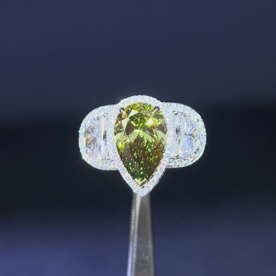 2.50CT VIVID GREEN PEAR CUT DIAMOND 3 STONE RING