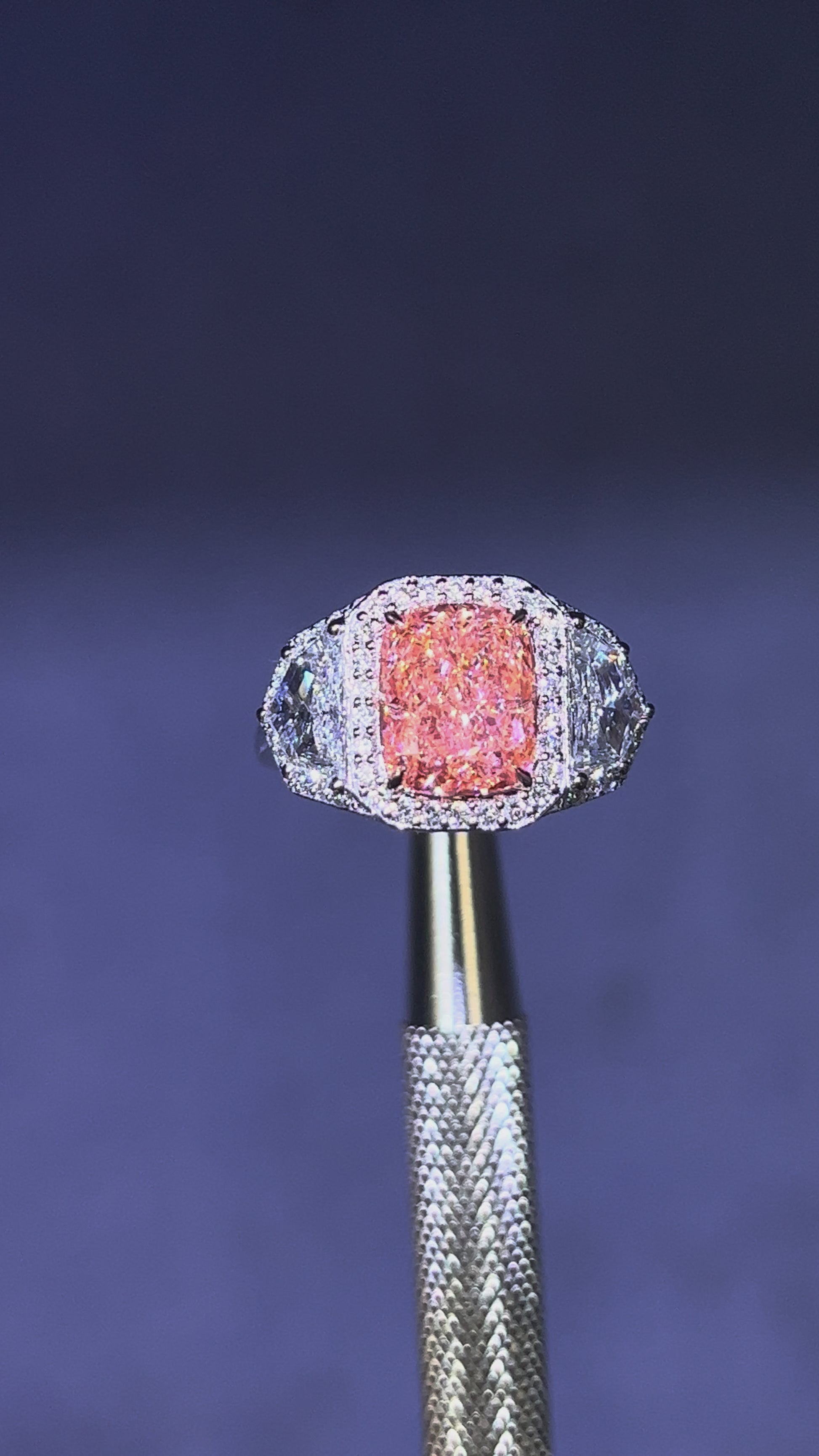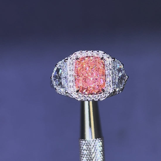 2.50CT VIVID PINK ELONGATED CUSHION CUT DIAMOND 3 STONE RING