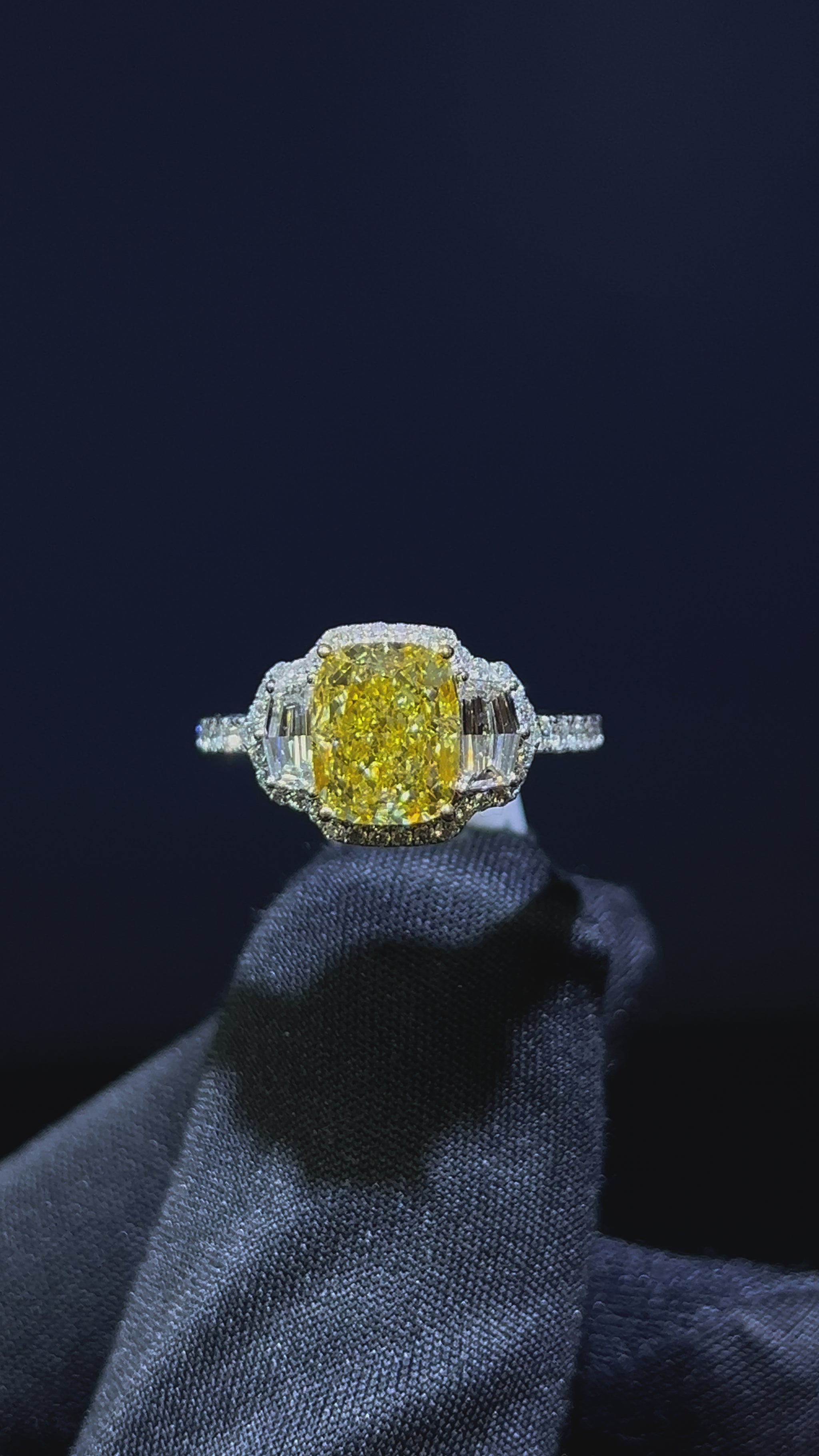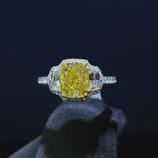 2.50CT VIVID YELLOW ELONGATED CUSHION CUT DIAMOND 3 STONE RING