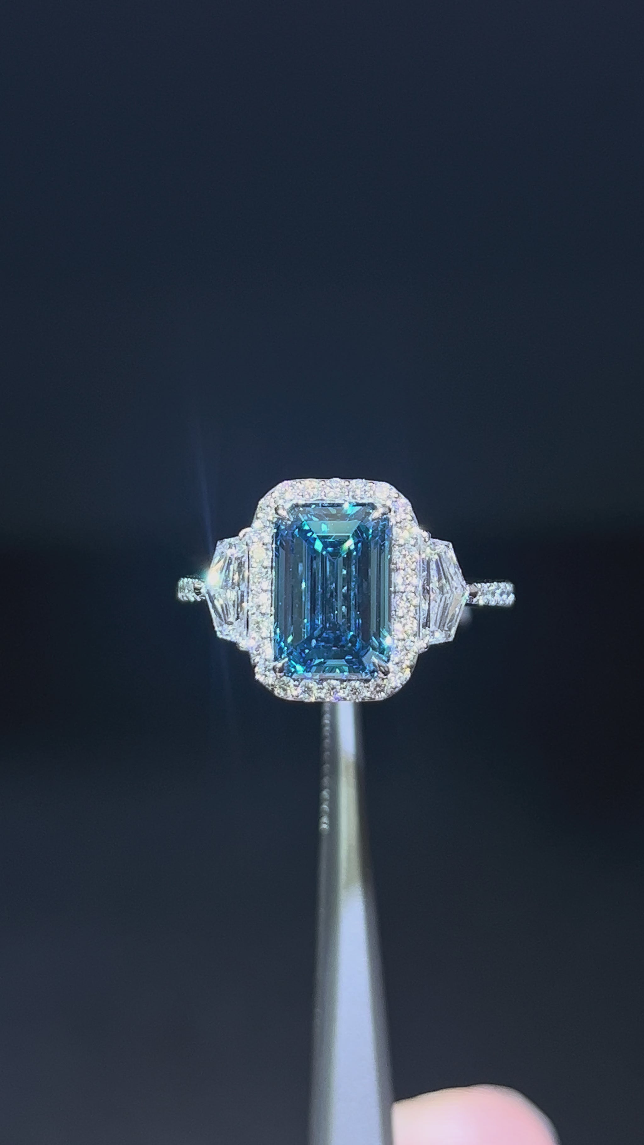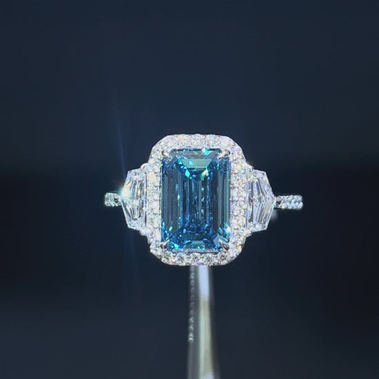 3.00CT VIVID BLUE EMERALD CUT DIAMOND 3 STONE RING