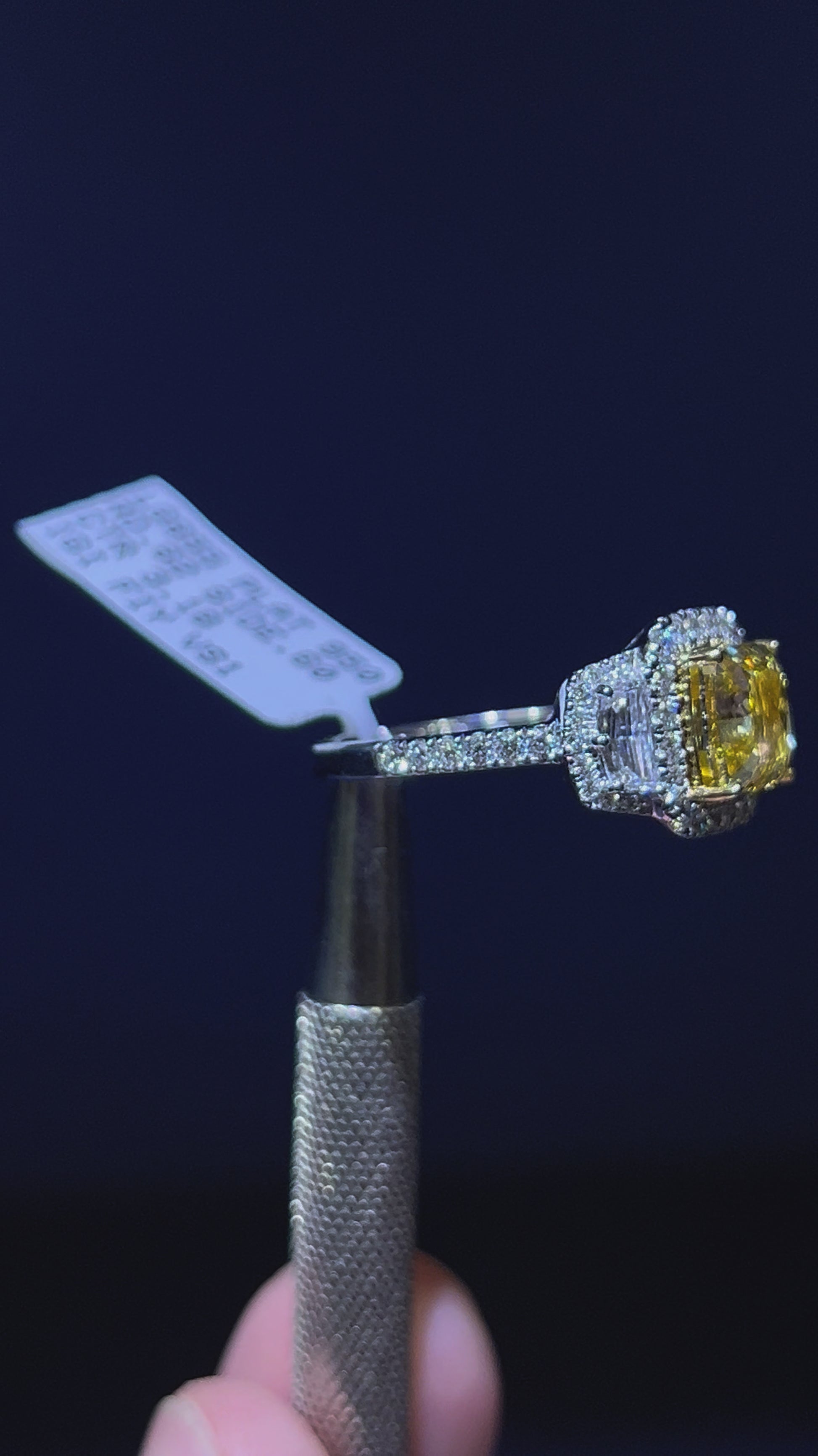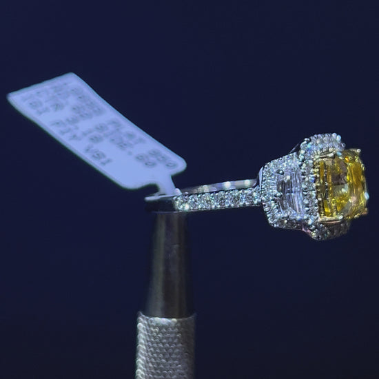 3.00CT VIVID YELLOW CUSHION CUT DIAMOND 3 STONE RING