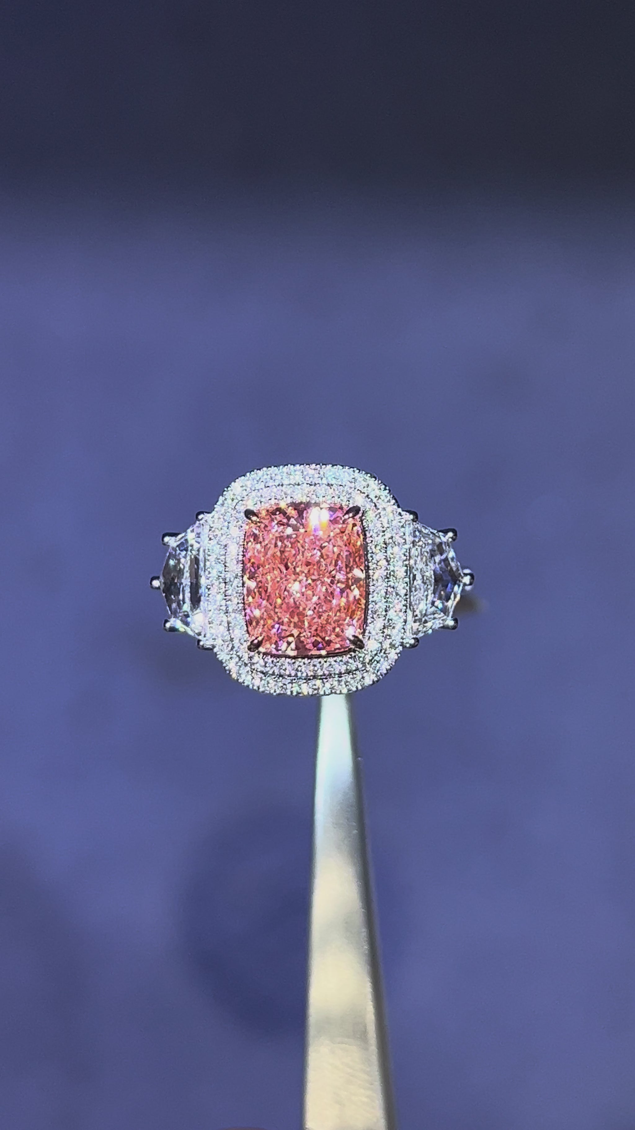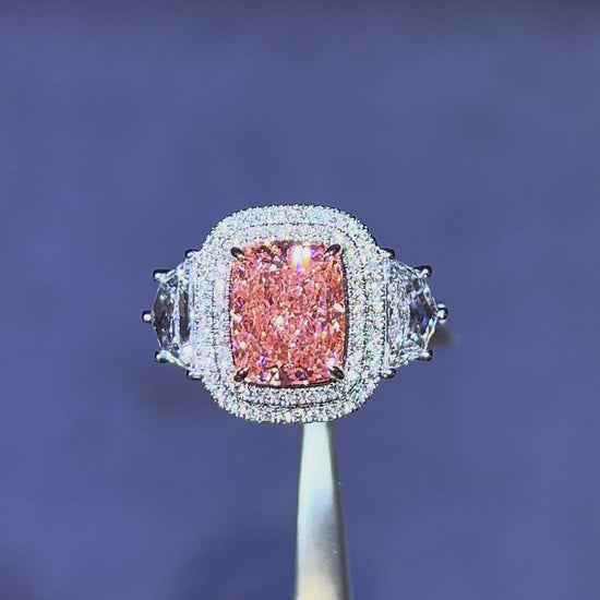 3.50CT VIVID PINK ELONGATED CUSHION CUT DIAMOND 3 STONE RING