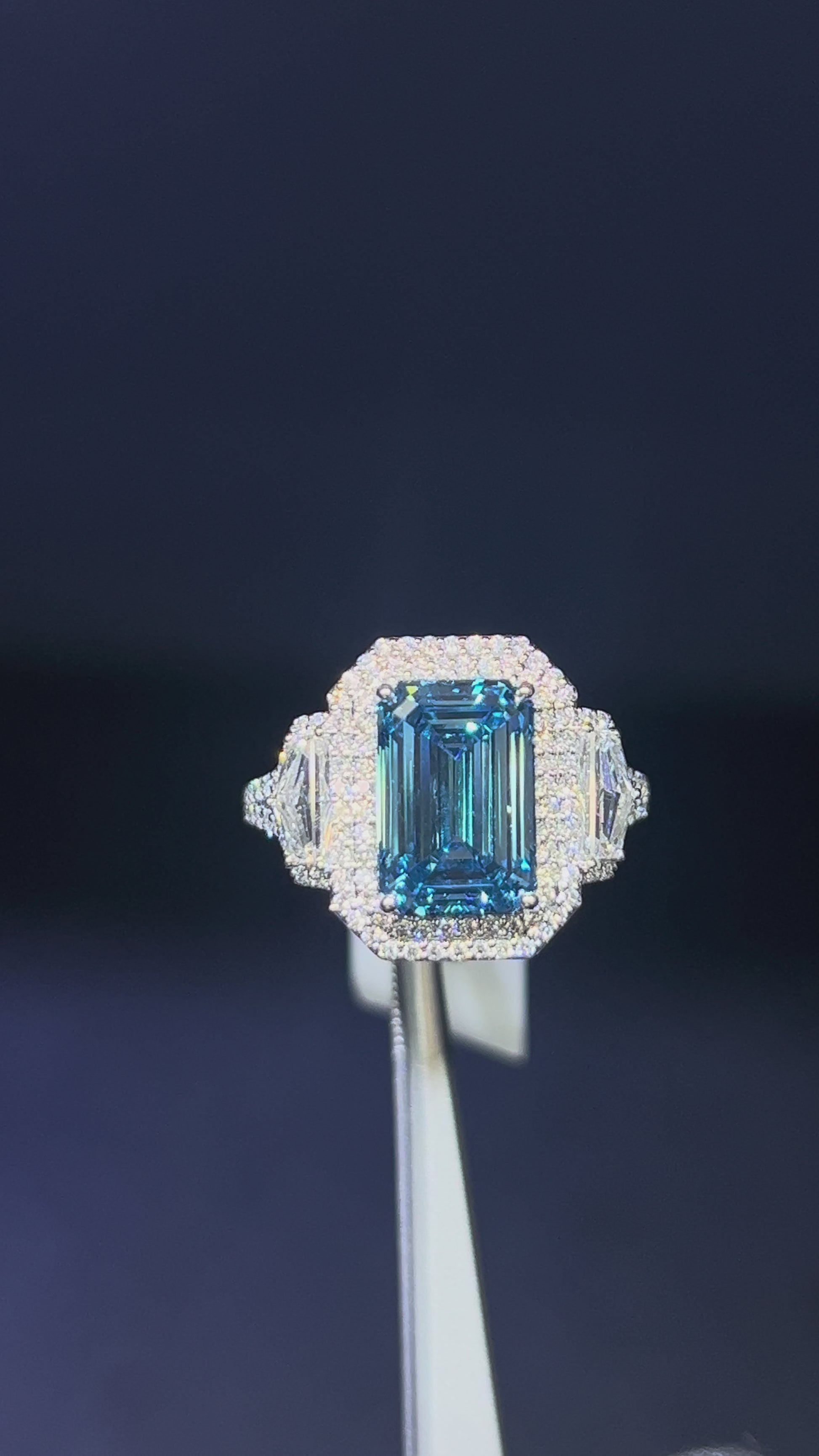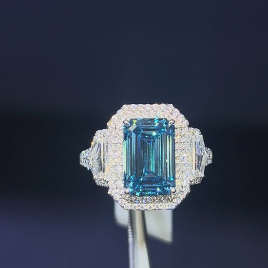 4.00CT VIVID BLUE EMERALD CUT DIAMOND 3 STONE RING