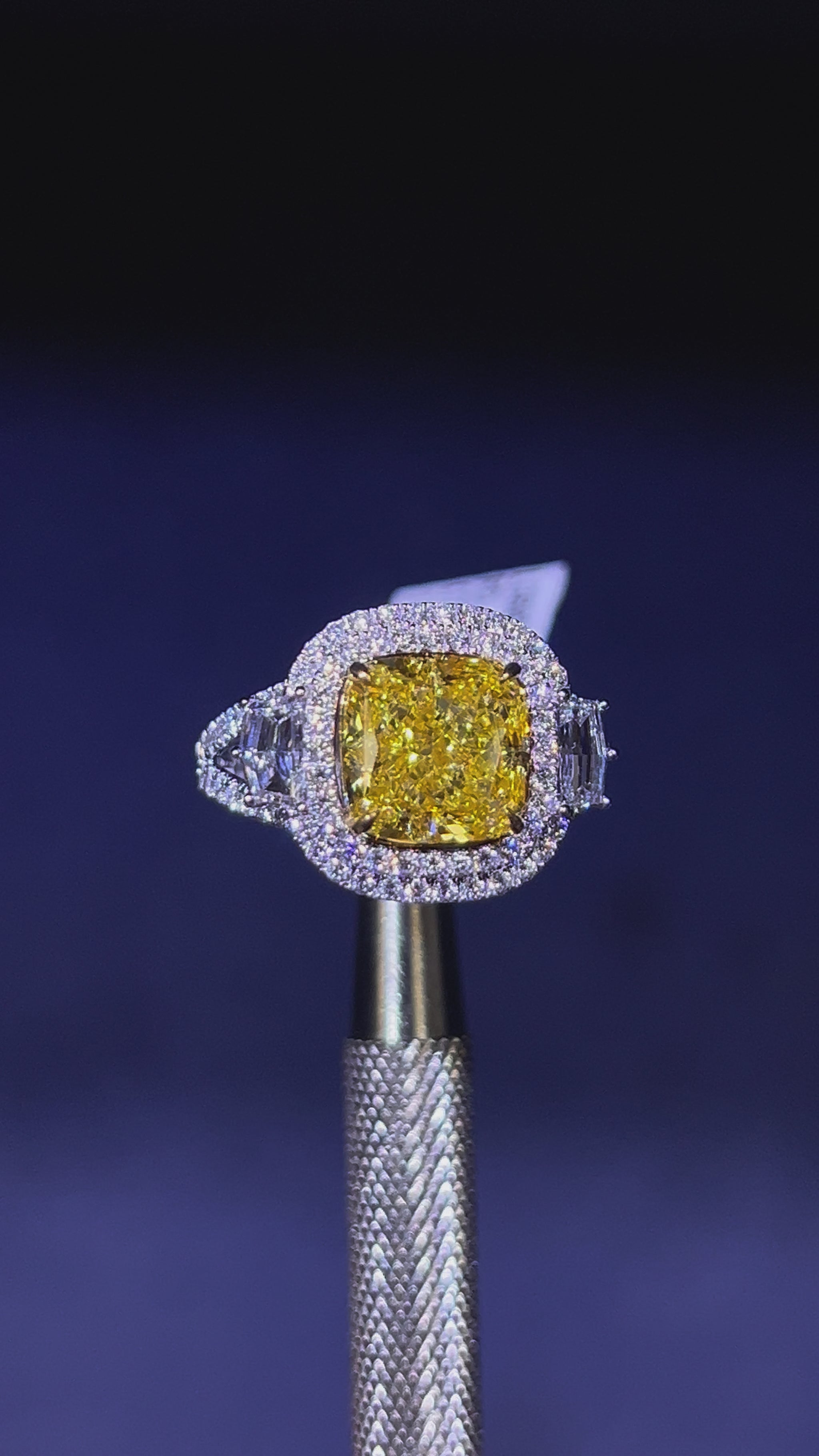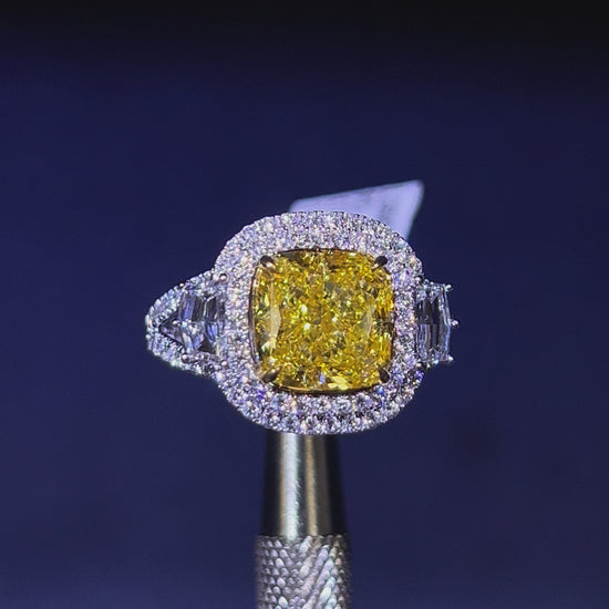 4.00CT VIVID YELLOW CUSHION CUT DIAMOND 3 STONE RING