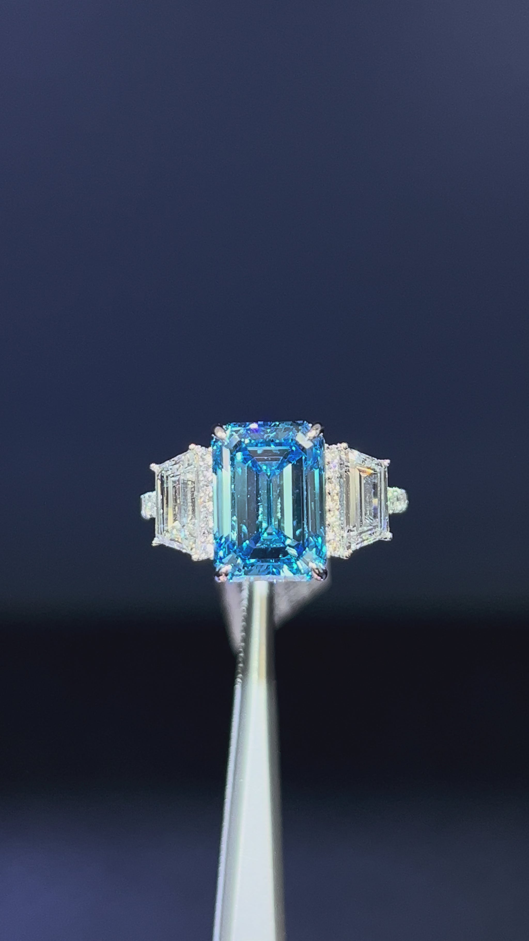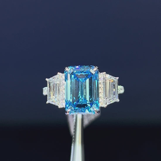 5.00CT VIVID BLUE EMERALD CUT DIAMOND 3 STONE RING