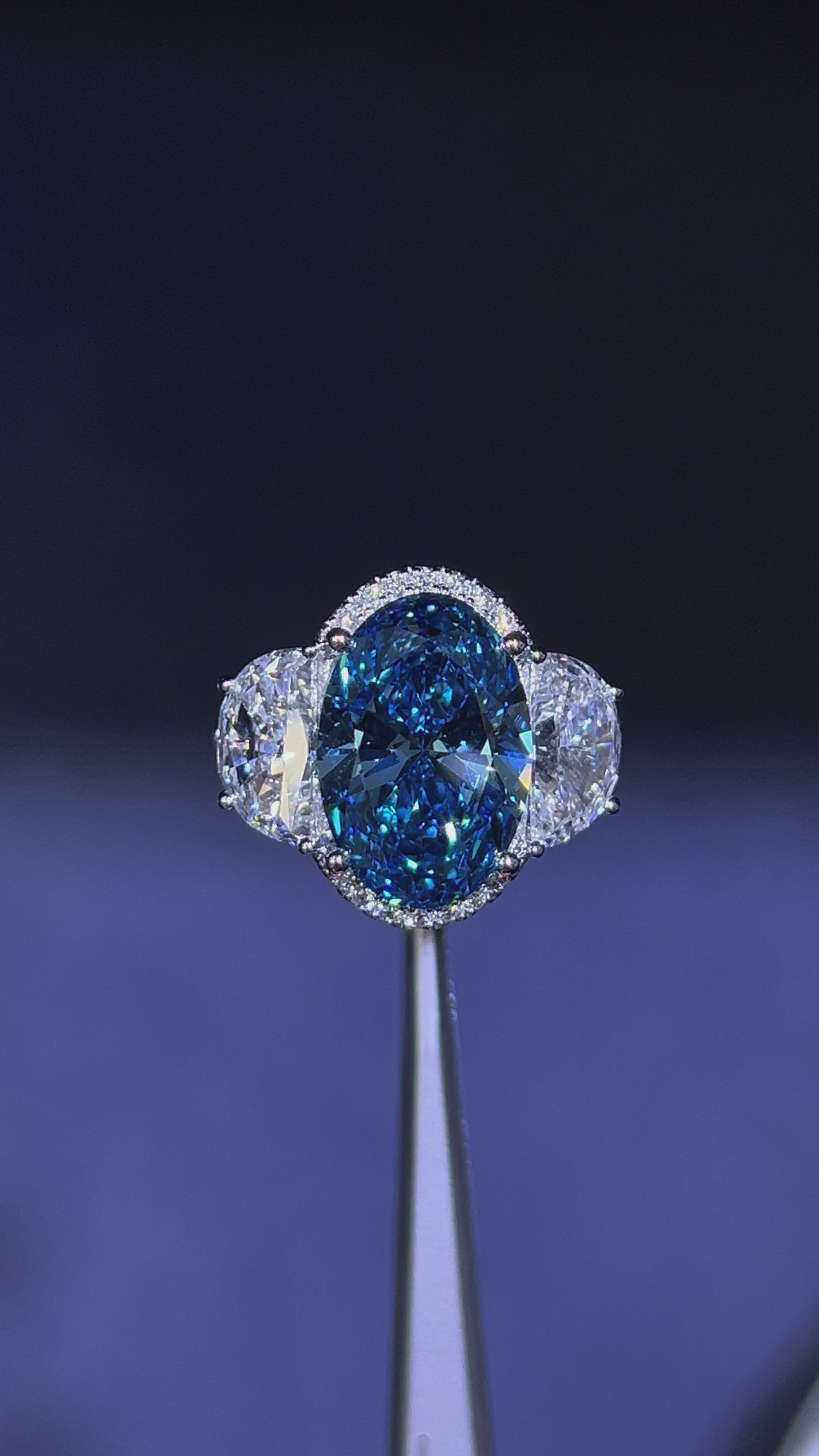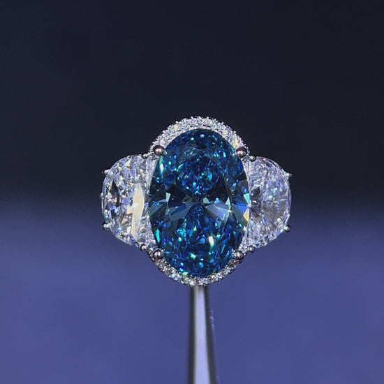 6.00CT VIVID BLUE OVAL CUT DIAMOND 3 STONE RING