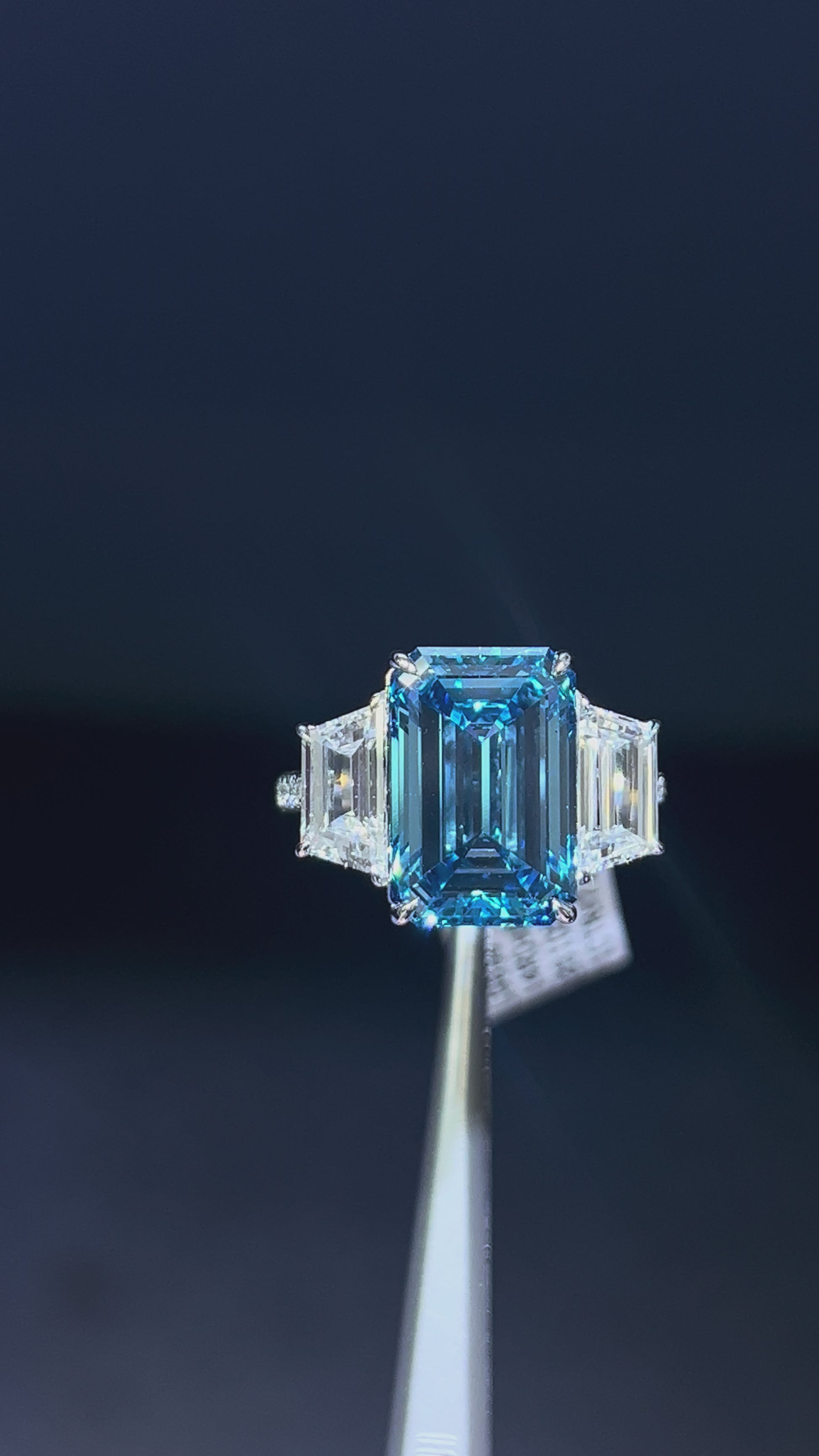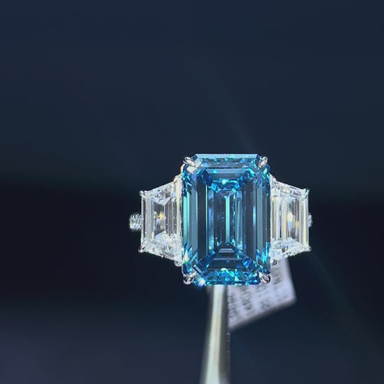 7.00CT VIVID BLUE EMERALD CUT DIAMOND 3 STONE RING